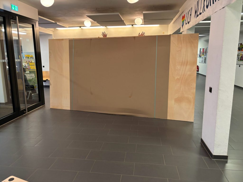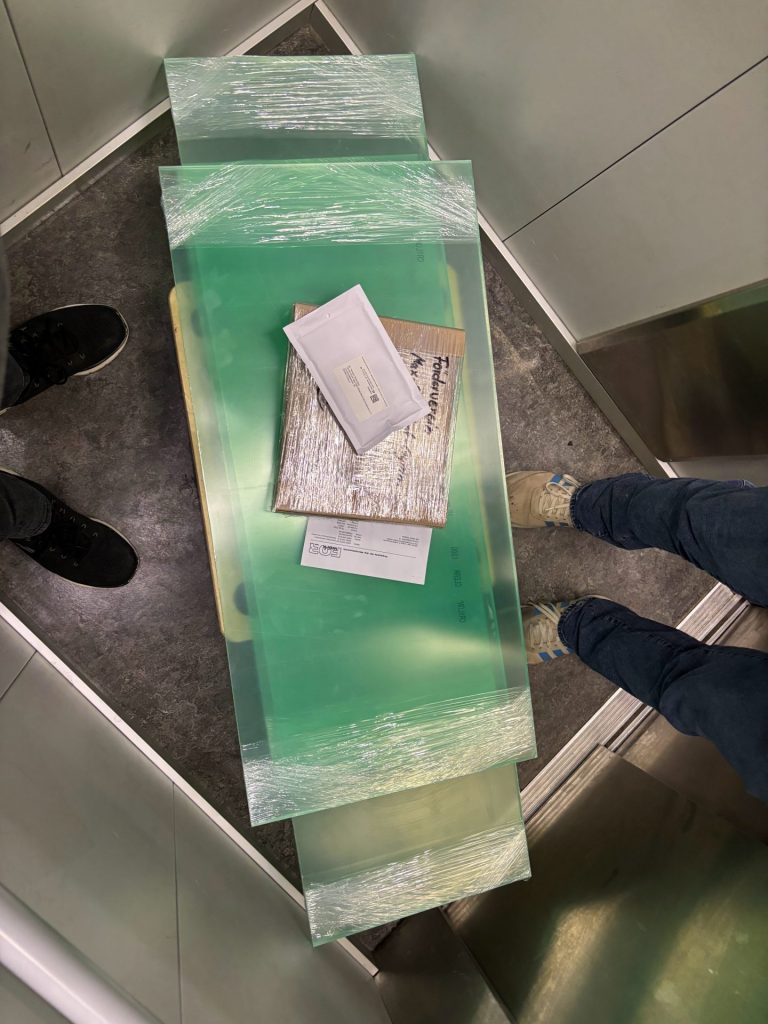 Ein besonders spannender Moment war die Anlieferung einer großformatigen Holzplatte (4 × 2 Meter), die aufgrund ihrer Größe per Gabelstapler geliefert wurde.