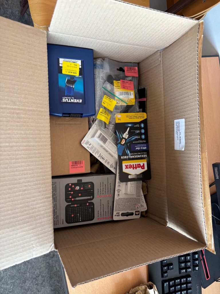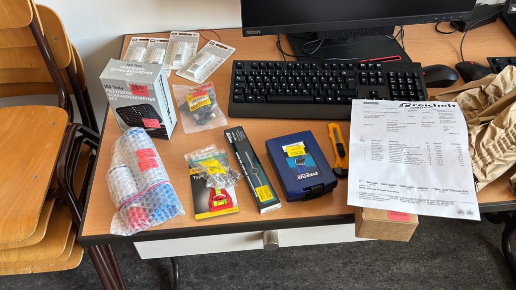 Zu den zentralen Grundkomponenten zählten unter anderem Bauteile für den 3D-Drucker – wie Düsen, Elektronik und das Hotend – sowie Fräseinsätze zur Materialbearbeitung, verschiedene Filamentsorten, Elektrobauteile, Schrauben und weitere Konstruktionskomponenten.