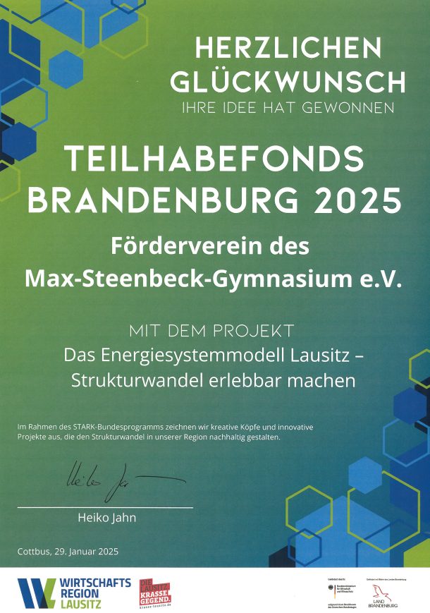 Unsere Schule erhält eine Förderung in Höhe von 45.000 Euro, zusätzlich bringt der Förderverein den Eigenanteil von 5.000 Euro ein (https://hetzner.steenbeck-gymnasium.de/foerderverein). Eine detaillierte Projektbeschreibung und aktuelle Beispiele erfolgreicher Projekte findet sich auf der Webseite der WRL (https://wirtschaftsregion-lausitz.de/neuigkeiten/teilhabefonds).
