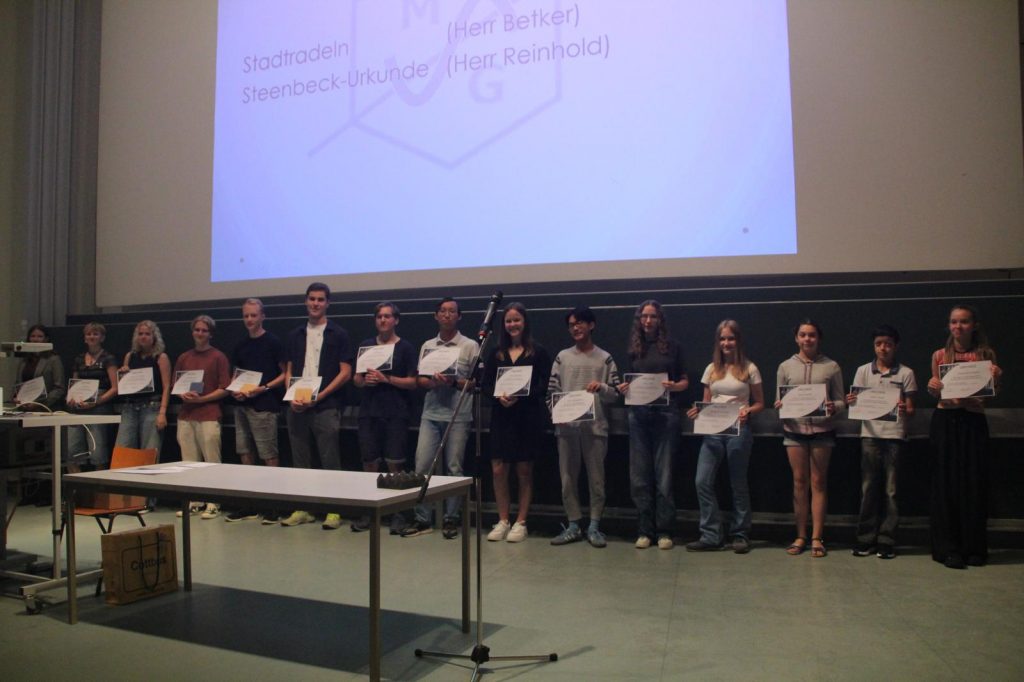 Besonders gewürdigt wurde das soziale Engagement vieler Schüler durch die Verleihung der Steenbeck-Urkunde. Diese Auszeichnung geht an Schüler, die sich über den Unterricht hinaus in besonderer Weise für das Schulleben einsetzen. In den Jahrgangsstufen 7 und 8 wurden je zwei Urkunden vergeben, in den Jahrgängen 9 und 10 jeweils drei, und in der Jahrgangsstufe 11 sogar vier.