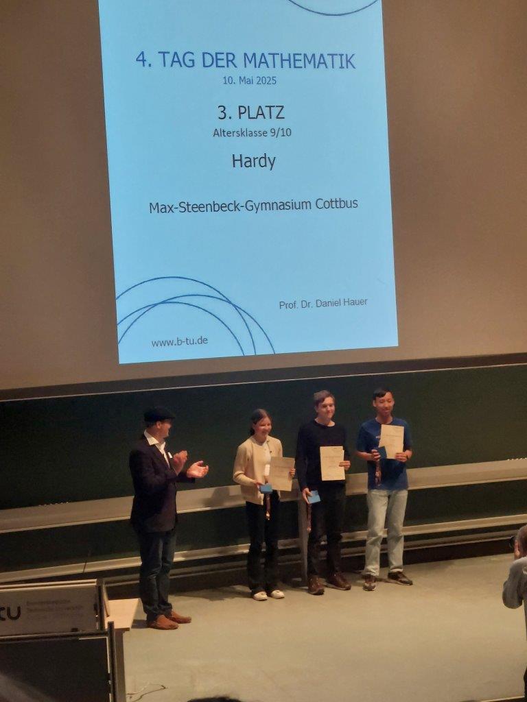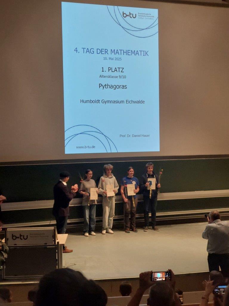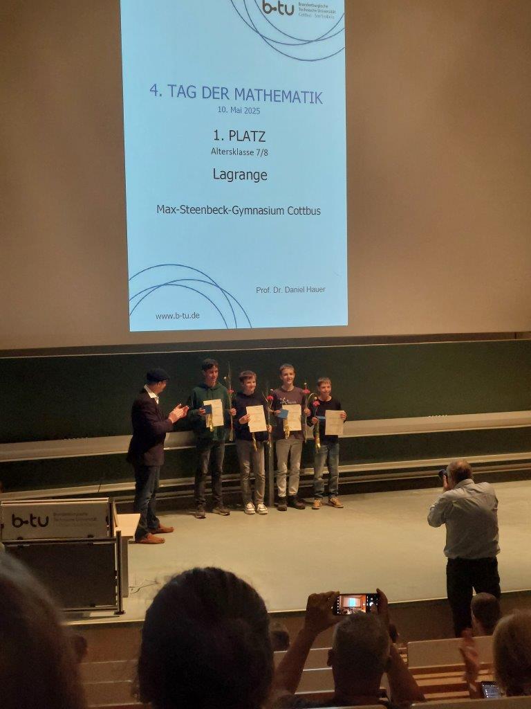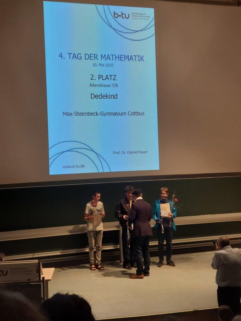 Ein Tag voller Teamarbeit! Am Samstag, dem 10. Mai, ab 9:15 Uhr fand an der BTU der „Tag der Mathematik“ statt. Dies ist ein Wettbewerb, bei dem Teams aus drei bis fünf Personen gegeneinander antreten und versuchen, so viele mathematische Aufgaben wie möglich zu lösen. Dabei sind mehrere Schulen und Altersklassen beteiligt, und die Aufgaben sind so anspruchsvoll, dass sie nur mit Gruppenarbeit zu schaffen sind. Und genau dieser Herausforderung stellten sich 19 Mannschaften aus den Klassenstufen 7 und 8 sowie weitere Teams in den Klassenstufen 9 und 10.