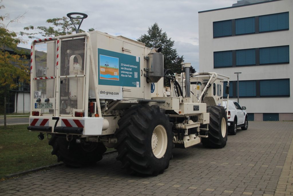 Ein besonderes Highlight war der sogenannte Vibrotruck: Mit seiner großen Rüttelplatte erzeugt er Schallwellen, die in den Untergrund geleitet werden. Geophone, also spezielle Empfänger, fangen diese Wellen wieder auf. Auf diese Weise können Geowissenschaftler Rückschlüsse auf die Beschaffenheit des Untergrunds ziehen, z.B. darauf, wo sich Gesteinsschichten befinden. Der ausgestellte Truck war ein Sondermodell, das extra für Demonstrationszwecke nachgebaut wurde. Er besitzt einige technische Extras, wie die Fähigkeit, sich auch seitlich zu bewegen, etwas, das bei den regulären Modellen nicht vorgesehen ist.