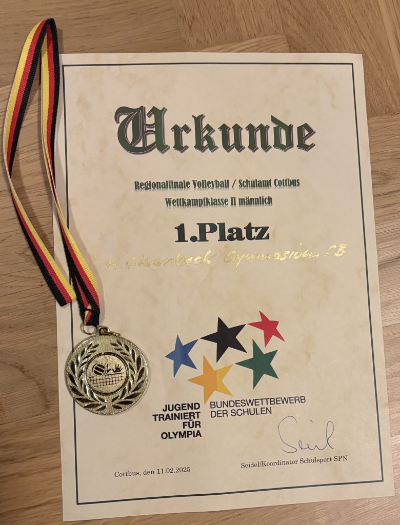 Beim gestrigen Regionalfinale konnten sich die U18-Volleyballer unserer Schule nach intensiven Duellen und einem Herzschlagfinale das Ticket für das Landesfinale in Brandenburg an der Havel am 20. März sichern und das Friedrich-Ludwig-Jahn Gymnasium aus Forst auf den zweiten und das Humboldt Gymnasium aus Eichwalde auf den dritten Platz verweisen.