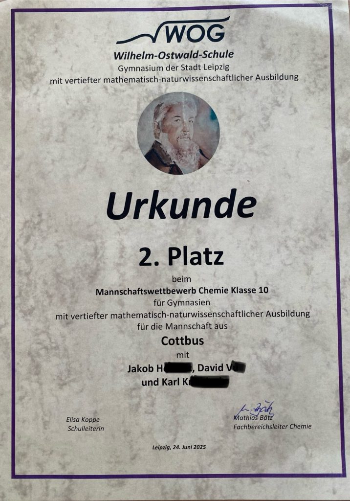 Am gestrigen Dienstag, dem 24. Juni 2025, fand am Wilhelm-Ostwald-Gymnasium in Leipzig der 32. Mannschaftswettbewerb Chemie für die Klassenstufe 10 statt. Drei unserer Schüler – Jakob H., Karl K. und David V. – stellten sich der Herausforderung einer anspruchsvollen 180-minütigen Klausur mit integriertem Experimentalteil.