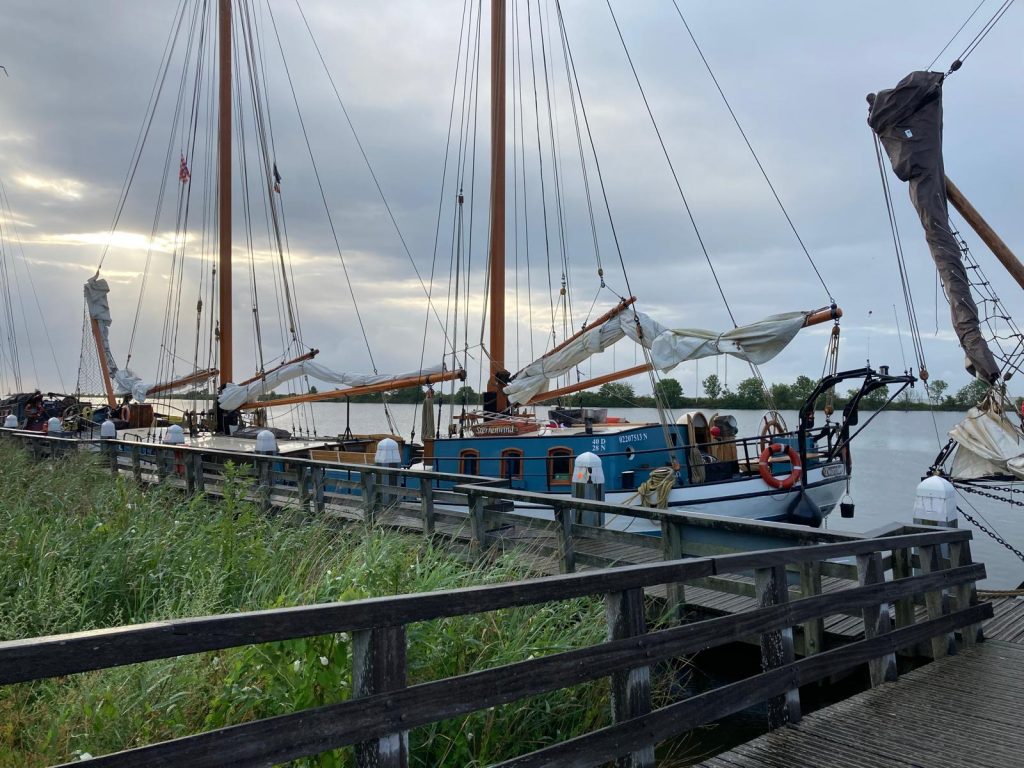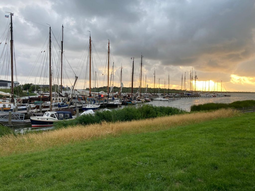Danach warfen wir den Anker, um zu baden – am Bug reinspringen, an Backbord an der Leiter wieder aufs Deck. Trotz der beiden Zuflüsse Geldersche IJssel und Zwarte Water war das Wasser leicht salzig. Baden konnten wir dann nochmals, als wir am letzten Tag an der Insel Aanmmeer eiland op Fluessen festmachten. Dort grillten wir dann auch und machten bei schönstem Sonnenuntergang noch viele Gruppenfotos.