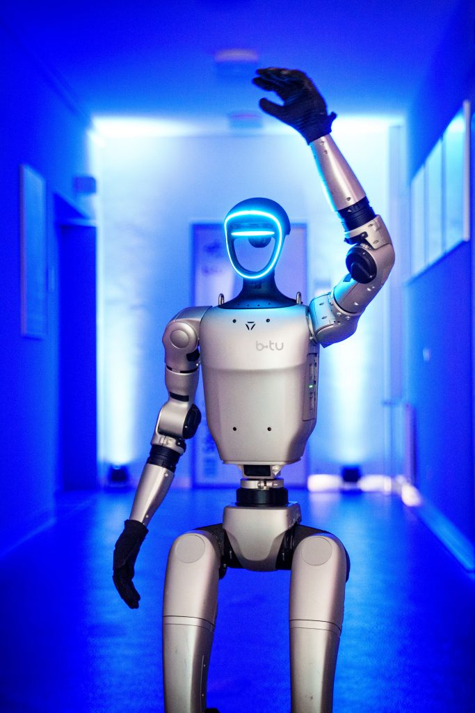 Und dann gibt es noch Eddy, ein Ganzkörperroboter, der eine Größe von etwa einem Meter dreißig hat. Er kann laufen, winken, die Hand geben und die Umgebung vermessen. „Er verfügt über eine 360-Grad-Sicht“, sagt Pascal aus der 9/1.