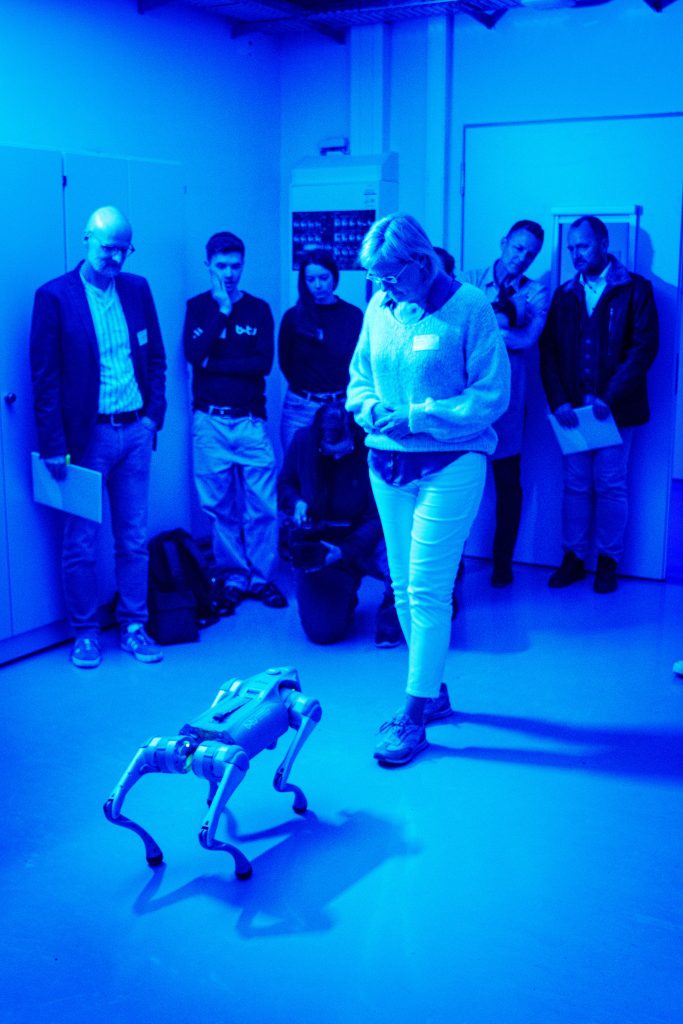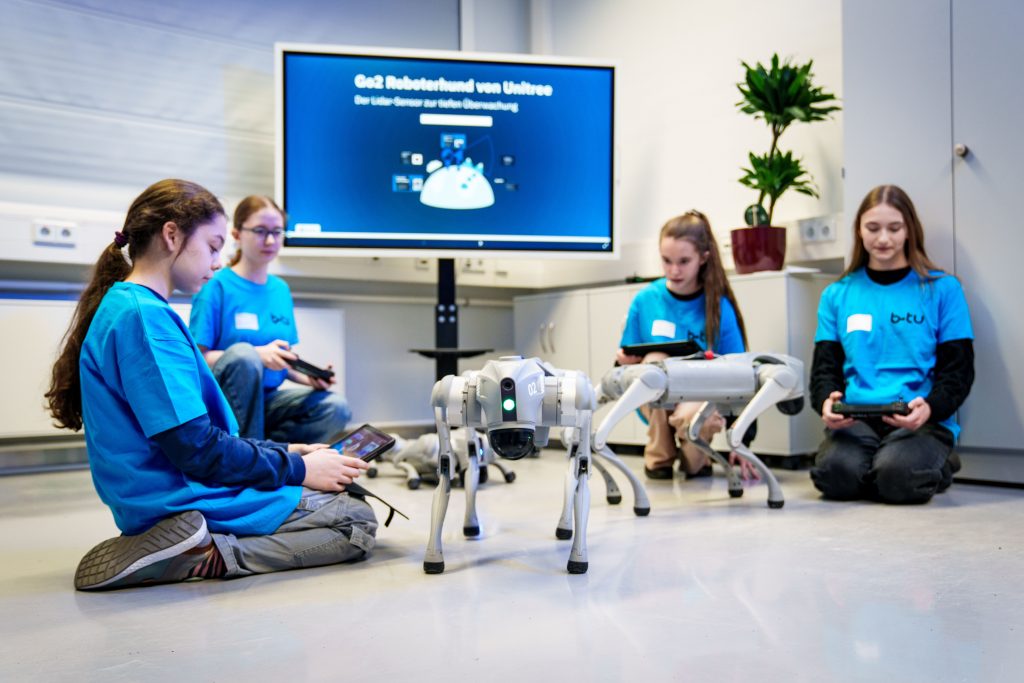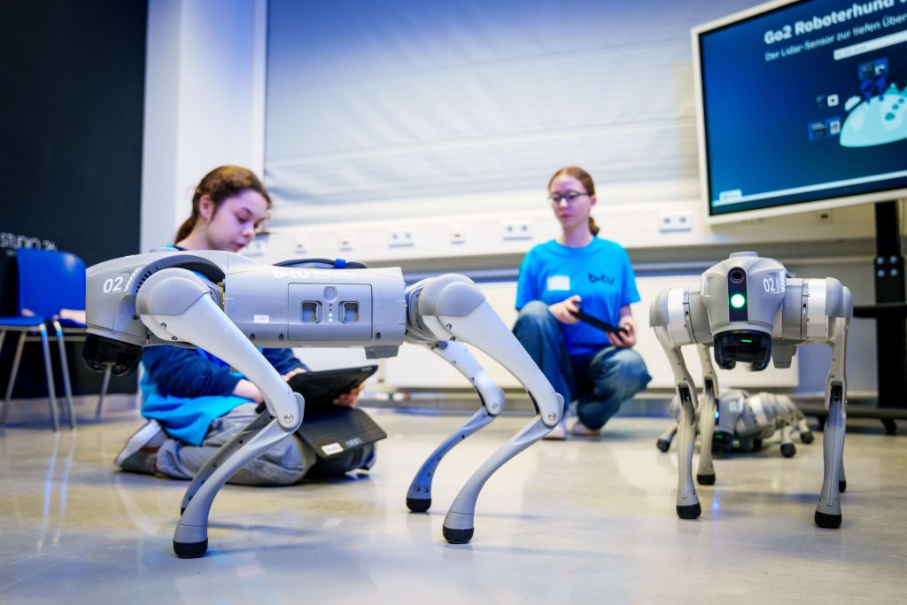 Außerdem können drei kleine Hunde-Roboter im Schülerlabor erforscht werden. „Die finde ich ganz cool, mit denen kann man viel machen“, sagt Mika (14). Die Hunderoboter können tanzen, sich hinsetzen und mit den Vorderpfoten ein Herz formen. Sie können von den Benutzern auch weiter personalisiert werden. Das größere Hunde-Roboter-Modell ist im DLR_School_Lab mit einem Staubsauger ausgestattet, der mit seinen Beinen gezielt Zigarettenstummel aufnimmt. Eine mit KI ausgestattete Kamera identifiziert den Müll in Echtzeit. Diese Idee stammt vom Italienischen Institut für Technologie in Genua.